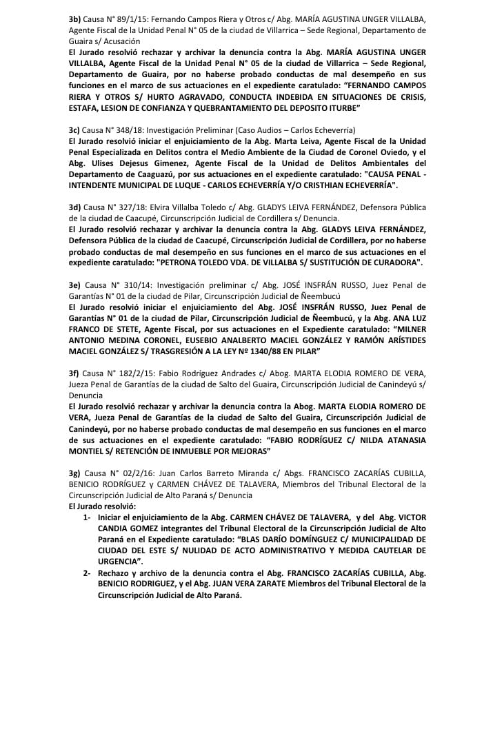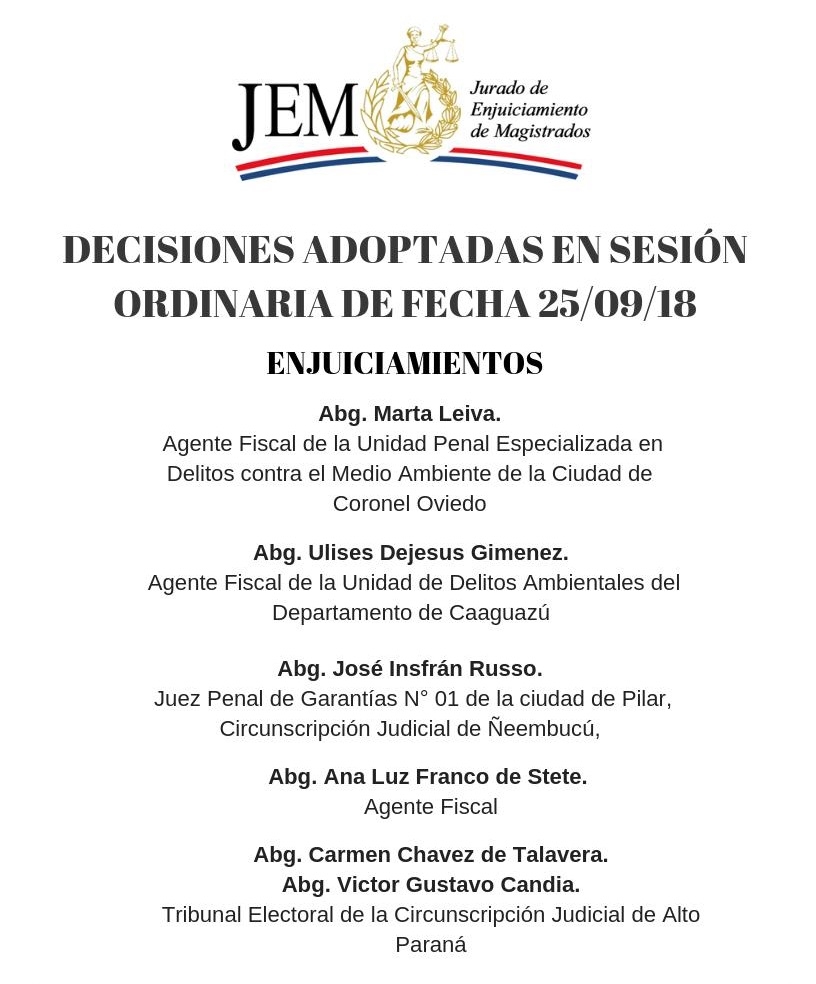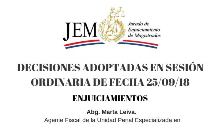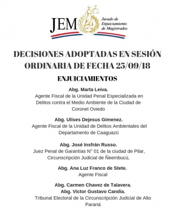 El Jurado de Enjuiciamiento de  Magistrados, JEM, tras la sesión realizada esta jornada,  enjuició  a los fiscales, Marta Leiva agente de unidad penal especializada en delitos contra el medio ambiente de Coronel Oviedo y del agente fiscal Ulises De Jesús Giménez, de Caaguazú por su actuación en el expediente caratulado, causa penal intendente municipal  de Luque, Carlos Echeverría y Cristian Echeverría.