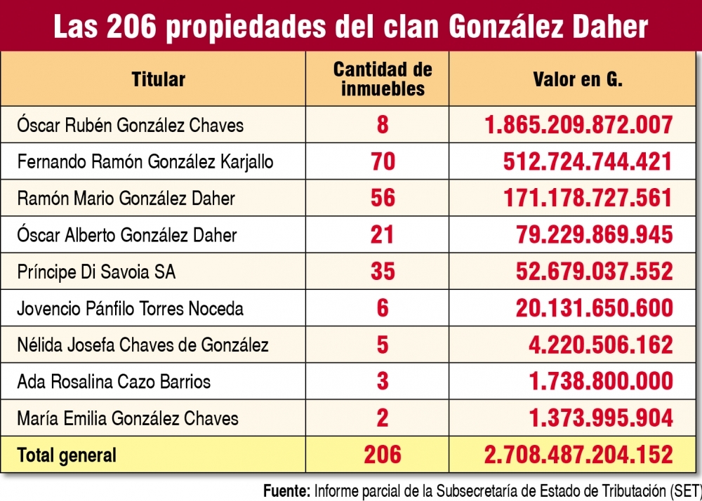 Ramón González Daher, por su parte, posee 56 inmuebles a su nombre, que valen más de G. 171.000 millones, y su hijo Fernando Ramón González Karjallo tiene 70 fincas valuadas en G. 512.000 millones.