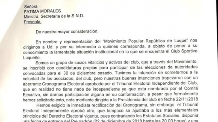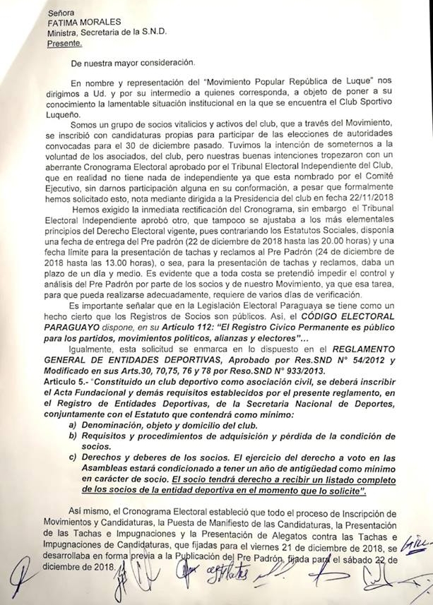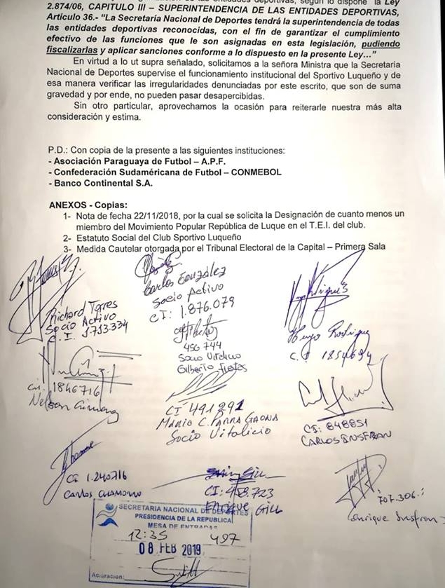 Presentación realizada ante la Secretaría Nacional de Deportes,  denunciando las graves irregularidades y el atropello a la institucionalidad que se está perpetrando en el Sportivo Luqueño, copias de esta presentación serán remitidas también a la A.P.F. y a la CONMEBOL; siguen en curso además el proceso ante el T.S.J.E., a más de otras denuncias que serán realizadas por la presunta posible comisión de delitos electorales