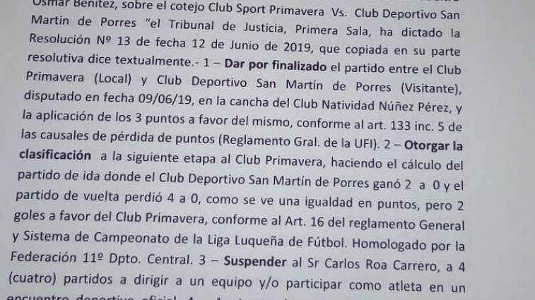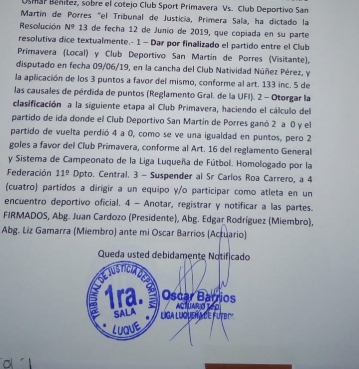 El Tribunal de la Liga Luqueña otorgó los puntos al Sp. Primavera