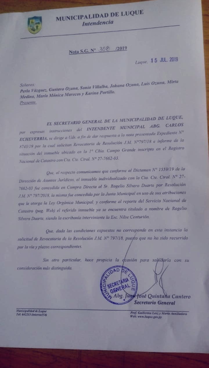 En el mes de octubre del 2018, la Junta Municipal de Luque, autorizó la venta directa de una propiedad de 1602 m2 por la irrisoria suma de 72 millones de guaraníes.