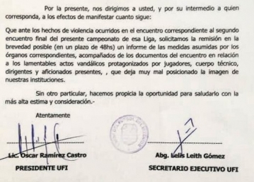 La UFI solicita informe sobre lo ocurrido el domingo pasado.