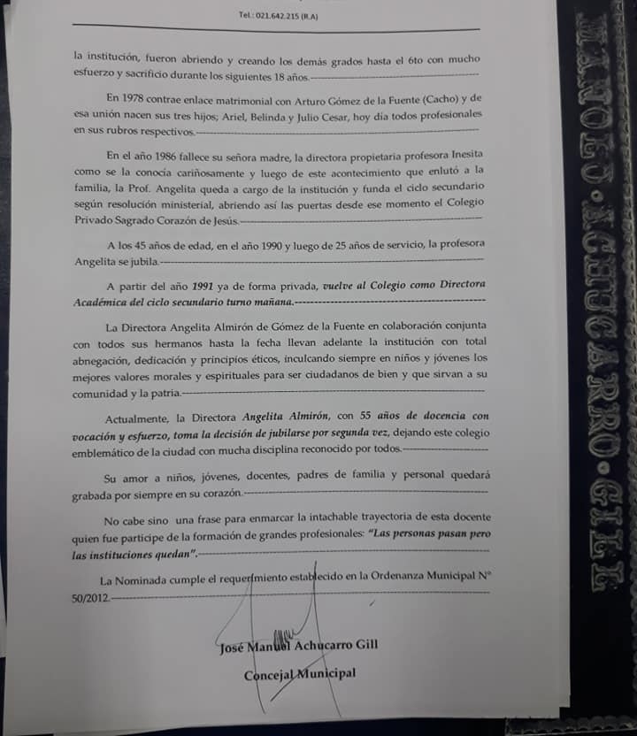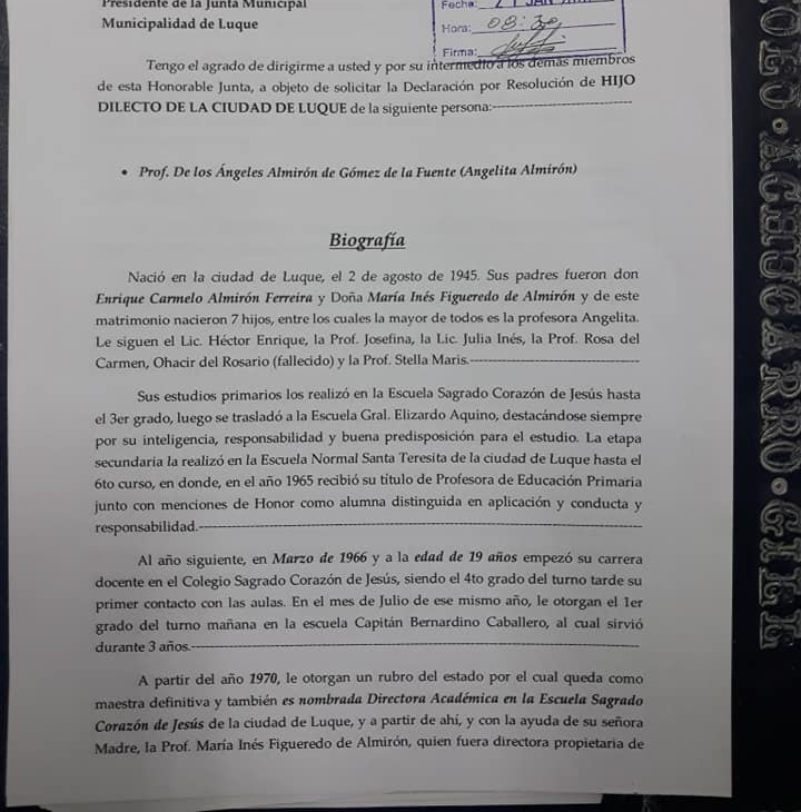 Declaran Hija Dilecta a la prof. De los Ángeles Almirón Gómez de la Fuente