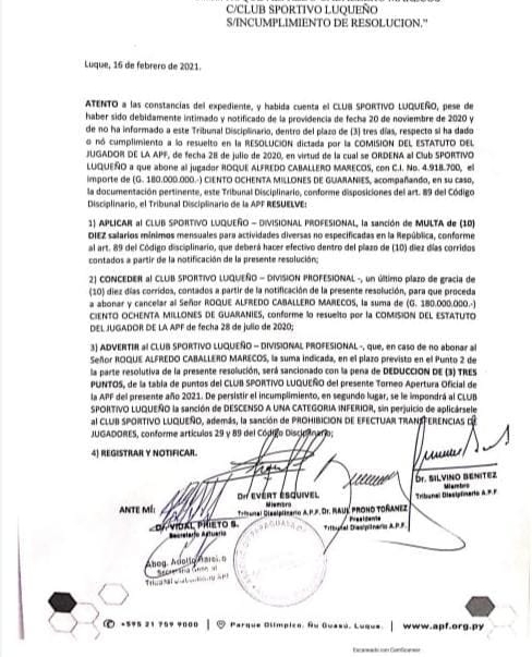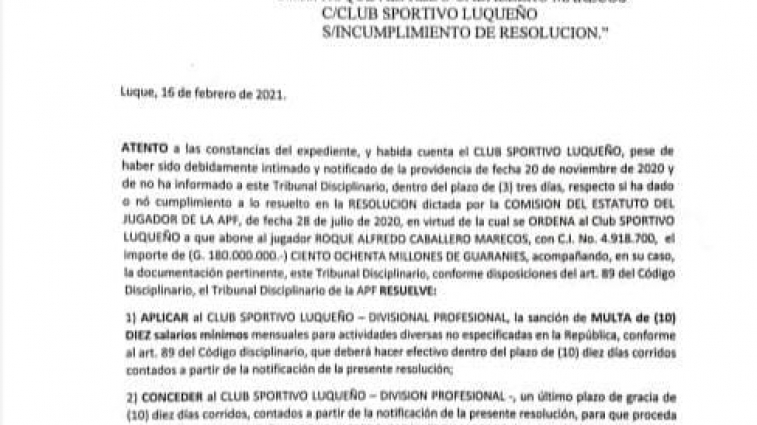 Sportivo Luqueño deberá pagar 180 millones de guaraníes