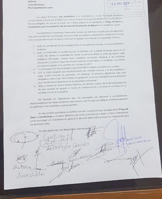 Presentan nota contra la aprobación del pliego en la Junta Municipal