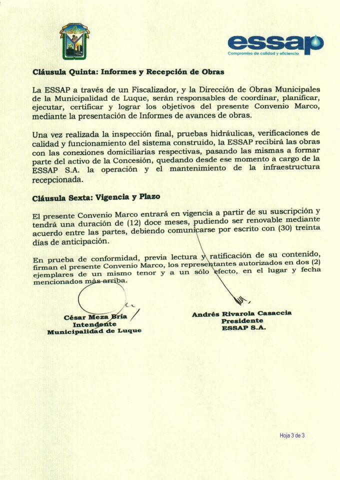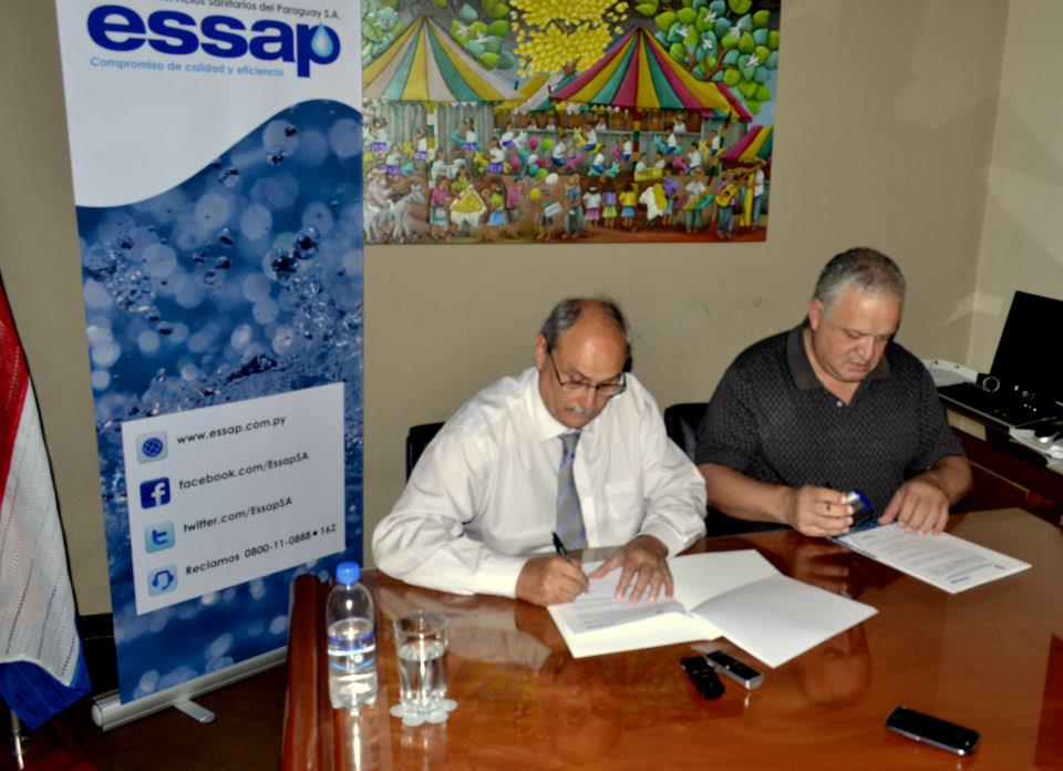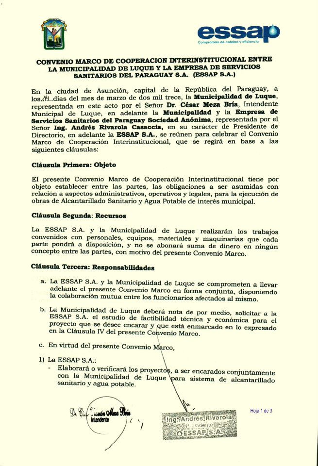 El intendente César Meza Bría y el presidente de la Empresa de Servicios Sanitarios del Paraguay S.A. (Essap) firmaron este mediodía un convenio con en el que ambas instituciones se comprometen a llevar adelante en forma conjunta un proyecto de ampliación de la red de desagüe sanitario en el Cuarto Barrio de Luque.