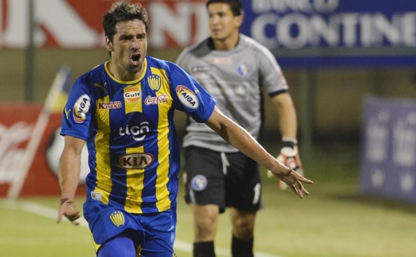 Hernán Rodrigo López celebra uno de los dos goles que convirtió durante la victoria de Sportivo Luqueño ante Sol de América