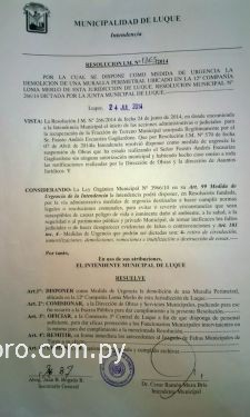 Funcionarios municipales pertenecientes a la dirección de Obras asistidos por profesionales de Asesoría Jurídica y efectivos policiales dieron ayer cumplimiento a la Resolución IM Nº 1365/14 que dispuso - como medida de urgencia - la demolición de una muralla construida en el perímetro de un terreno privado municipal ubicado sobre la calle 2da Capital, en la 12º Compañía Loma Merlo, por parte del señor Fausto Andrés Escauriza Gagliardone. La medida fue solicitada por la Junta Municipal mediante la Res. JM Nº 266/2014 de fecha 24 de junio del presente año.