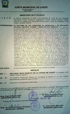 Anoche, en el local de la Asoc. de Funcionarios del Senado, en el barrio Las Palmeras, el conocidodirigentedeportivo Juan DaríoCáceresAbbaterecibió la distinción de HijoDilecto de la Ciudad de Luque, reconocimientomáximoquebrinda la comuna a personas destacadas, establecida en la Resolución J.M. Nº 441/2014, quefuepromovidapor los concejales Carlos EcheverríaEstigarribía y Pedro AvelinoGonzálezBordón, promulgada el pasado 19 de septiembre.