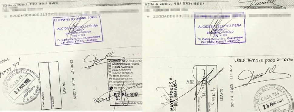 Carmen Benítez contó a ABC Cardinal que la diputada concretó la compra de las bombas y las pagó con dos cheques de pago diferido; sin embargo, cuando los mandó efectivizar, le informaron en el Banco Nacional de Fomento (BNF) que la cuenta de la diputada colorada carecía de fondos.