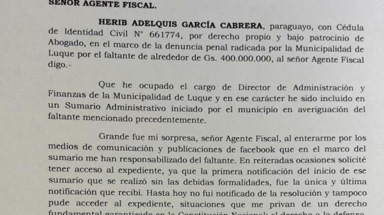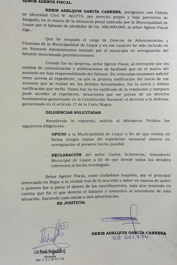 El ex Director de Finanzas de la Municipalidad de Luque, requiere además la declaración del Intendente Carlos Echeverría.