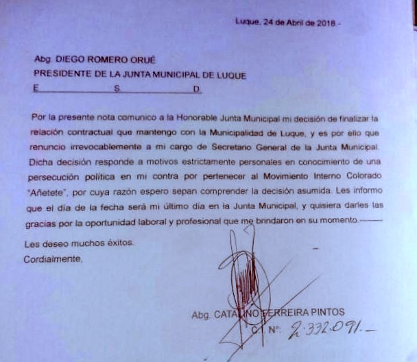 El propio Pdte. Diego Romero le exigió que dimita, finalmente Catalino Ferreira renuncio argumentando persecución política.