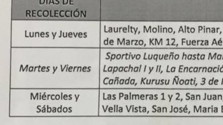 Cambios en los días de recolección de basuras en algunos barrios de Luque