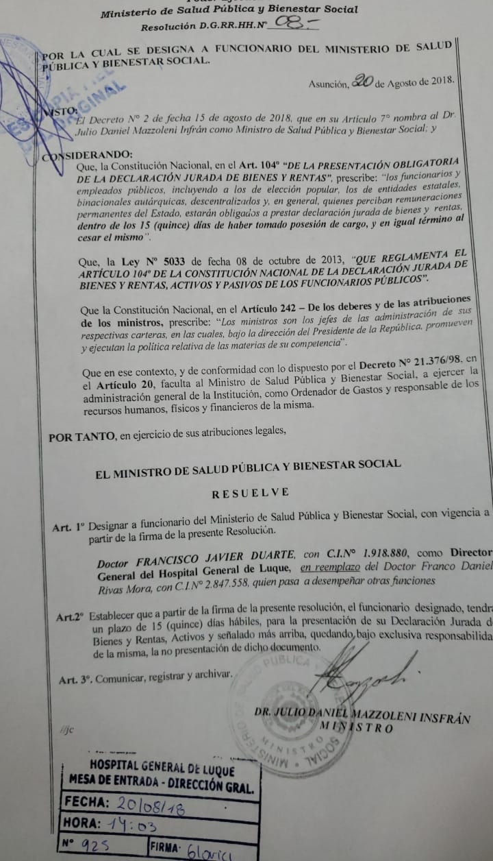 El Dr. Francisco J. Duarte volvió a asumir como Director del Hospital General de Luque