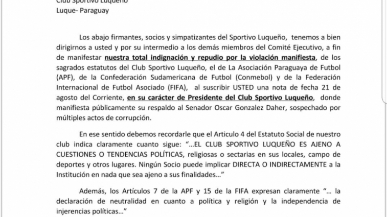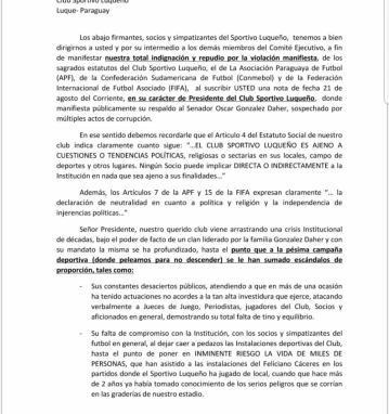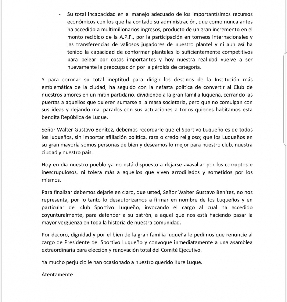 Socios del S. Luqueño solicitarán la renuncia de Walter G. Benítez