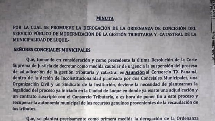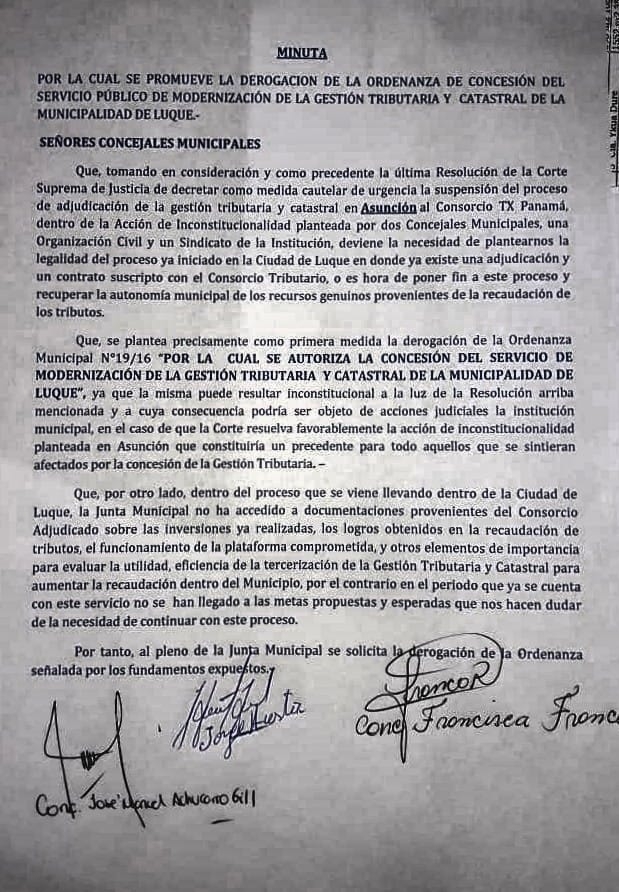 La minuta fue presentada en la sesión de la Junta Municipal de Luque