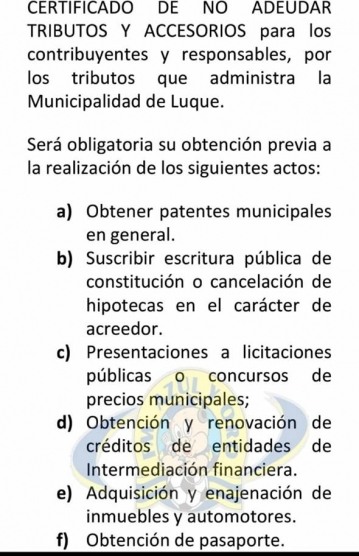 Proyecto de Ordenanza tributaria para el 2019 prevé fuertes sanciones a los contribuyentes, tanto en multas como limitaciones para actividades civiles. Los Luqueños que no tengan al día sus impuestos no tendrán derecho a créditos, obtener pasaportes, comprar o vender automotores, entre otros. Para visualizar el proyecto, abrir documento en Pdf.
