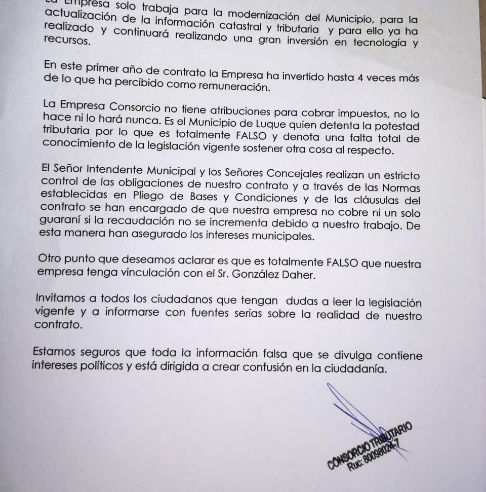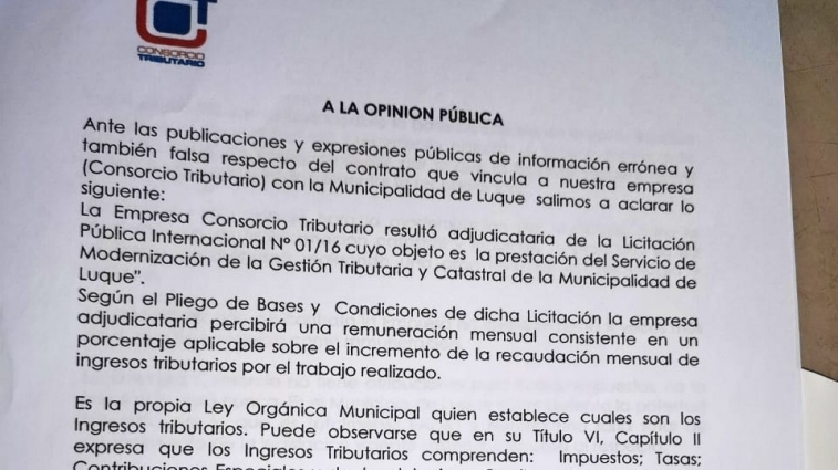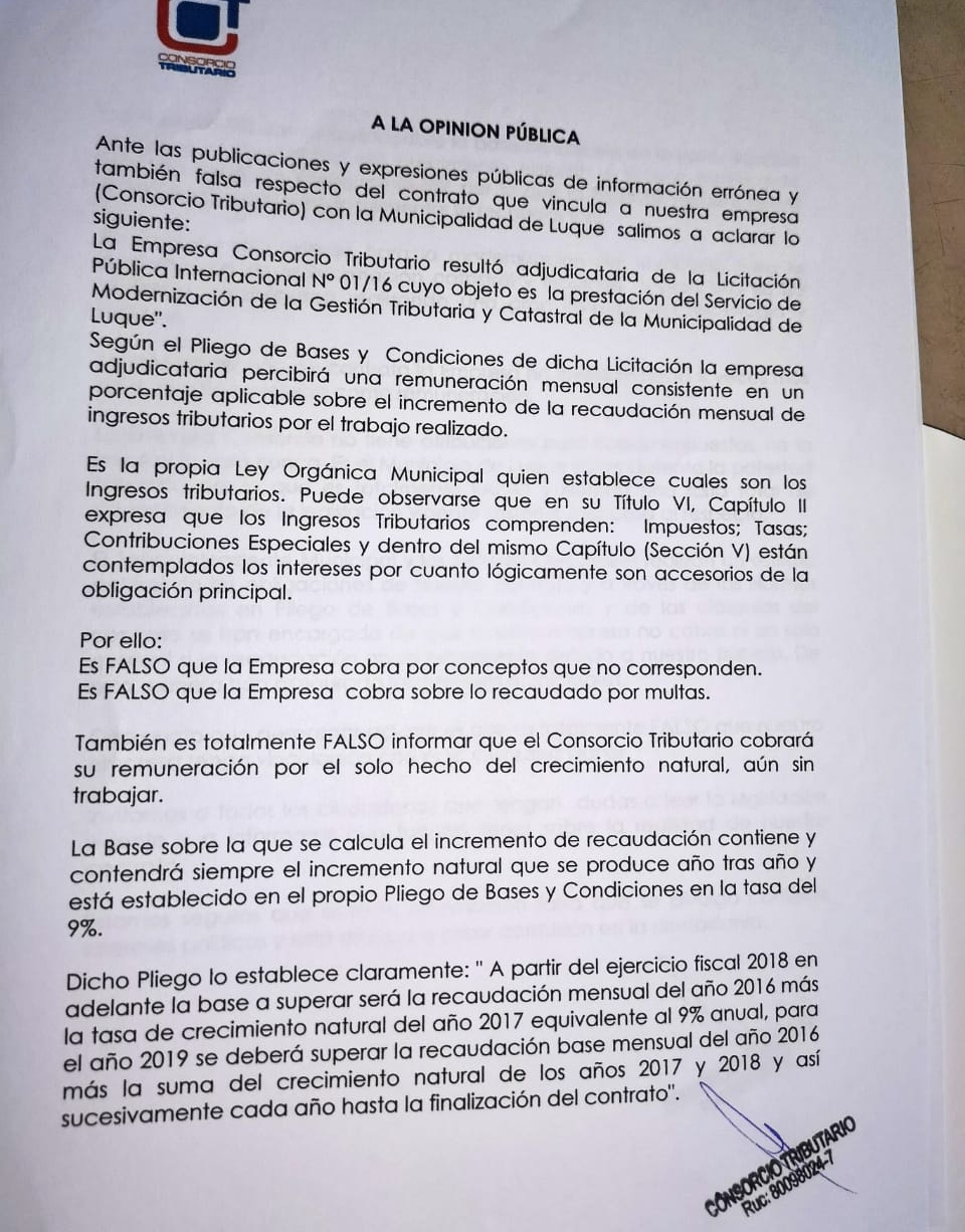 Comunicado de la empresa Consorcio Tributario