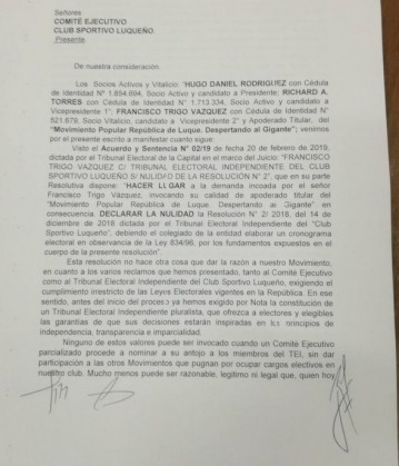 El movimiento Rca. de Luque solicitó cambio total en el TEI del Sportivo Luqueño
