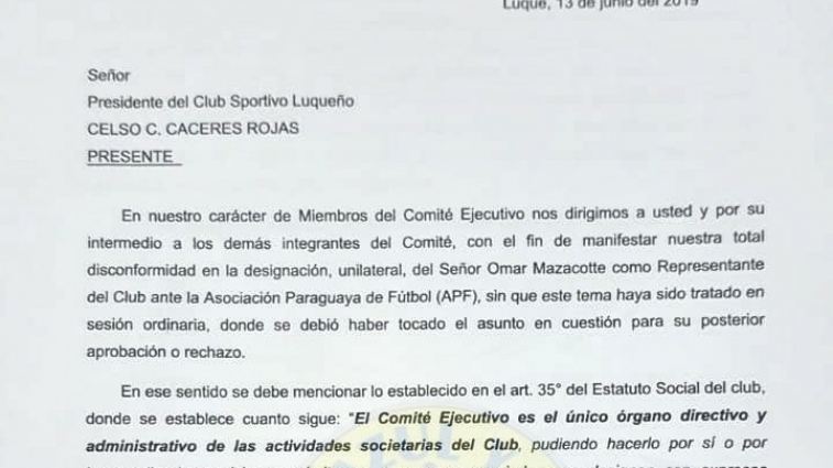 Movimiento Rca. de Luque cuestiona a Omar Mazacotte