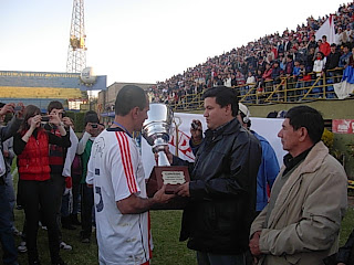 Alfredo Amarilla, recibiendo de manos del Pdte. de la Liga Luqueña de Fútbol, Juan Ángel Mareco, la copa de Vice Campeón