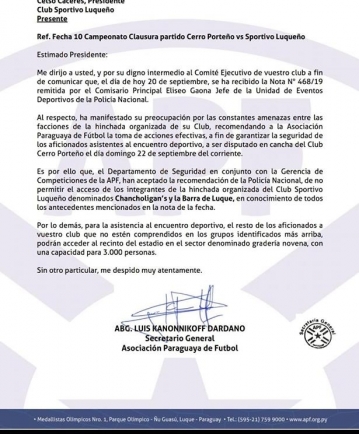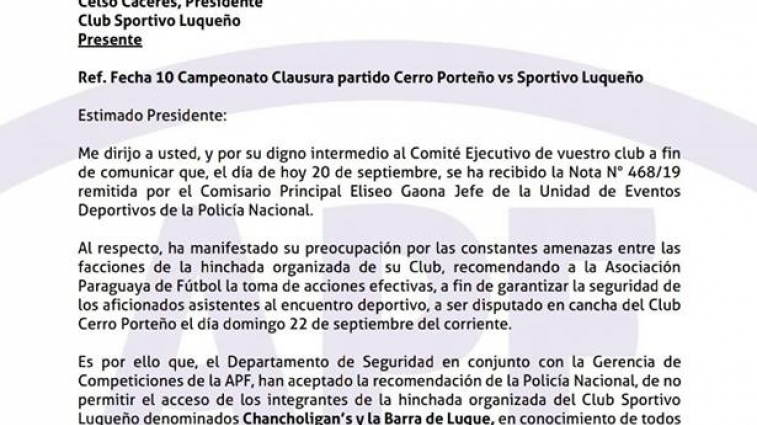 Los Chancholigan's y los de la Barra de Luque no podrán ingresar como barras organizadas.