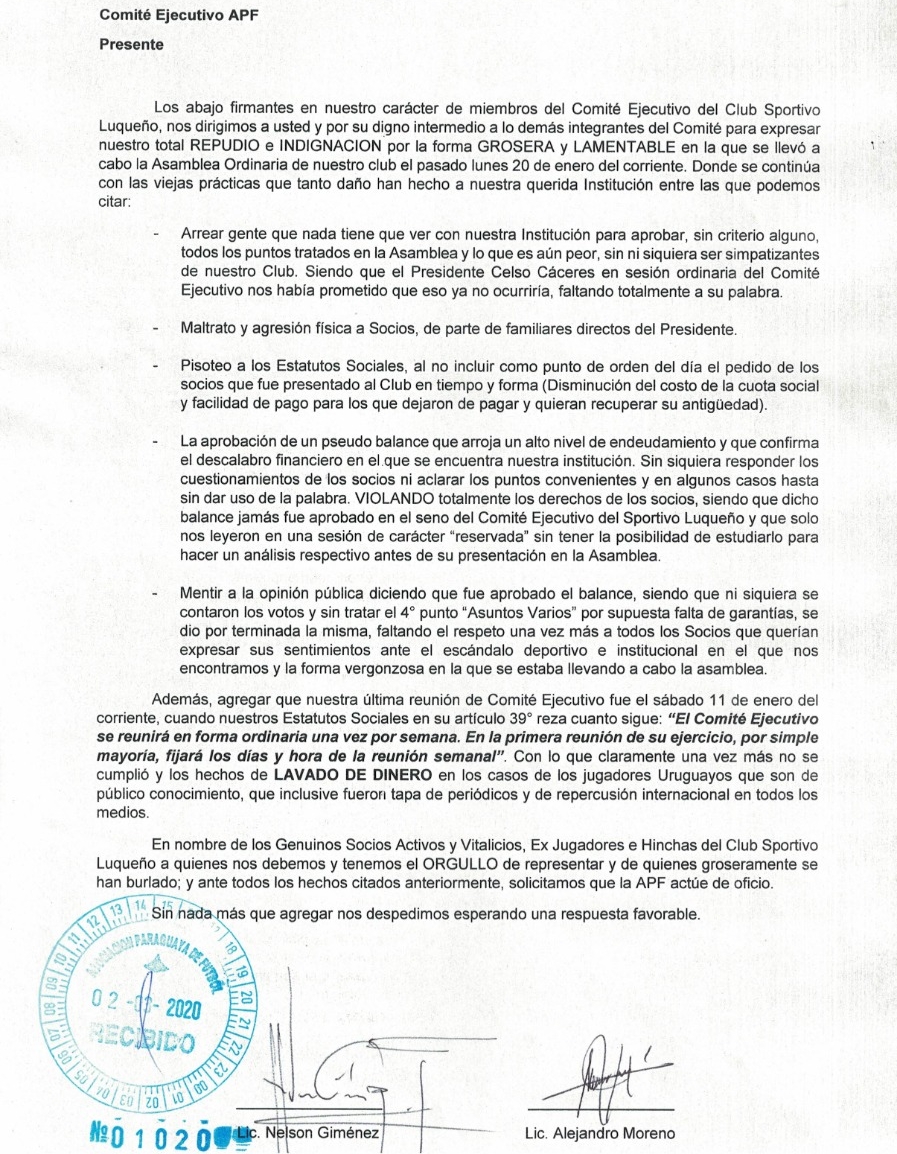 Denuncian ante la APF irregularidades de la última asamblea del Sportivo Luqueño.