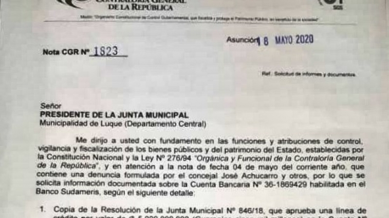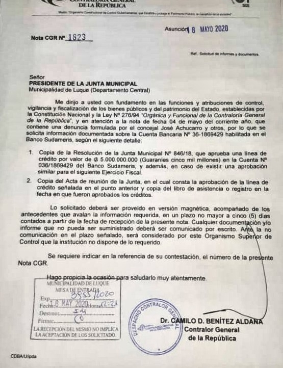 Contraloría General de la Rca. solicita informes a la Junta Municipal