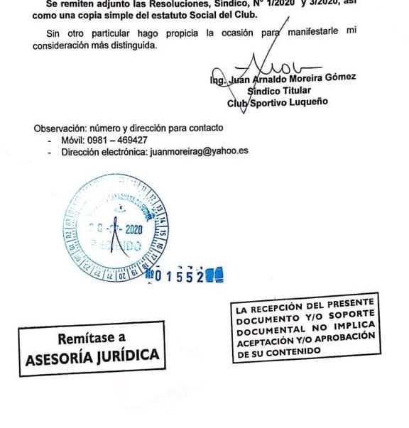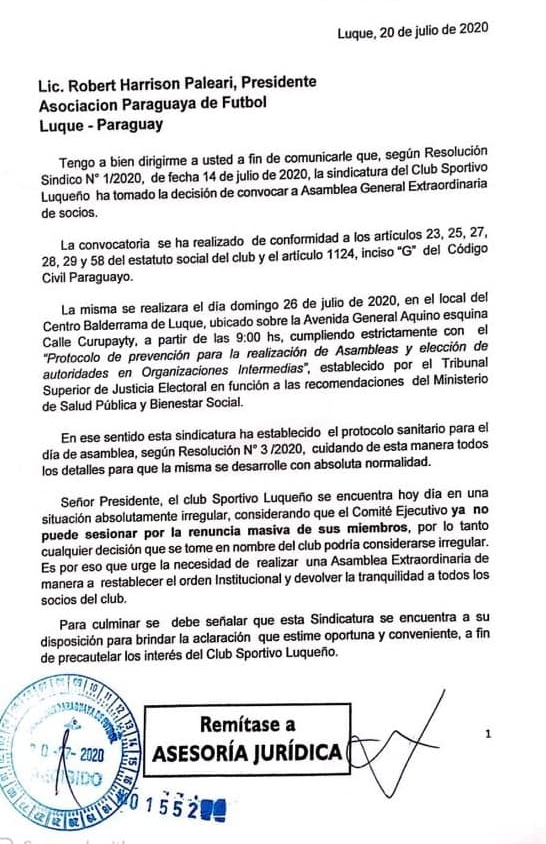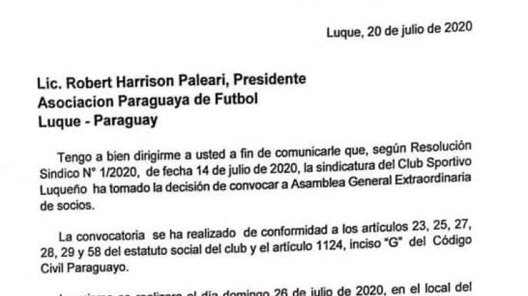 Nota para la APF del Síndico del Sportivo Luqueño