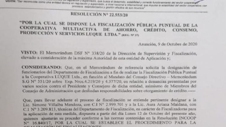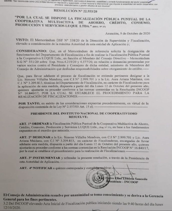 El Incoop fiscaliza a la Cooperativa Luque Ltda.