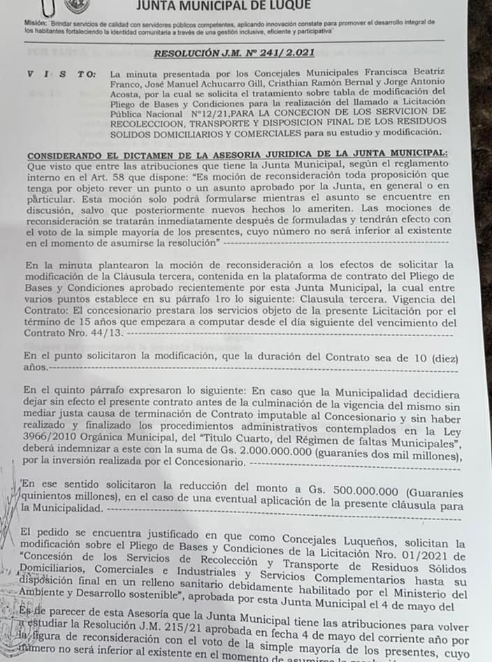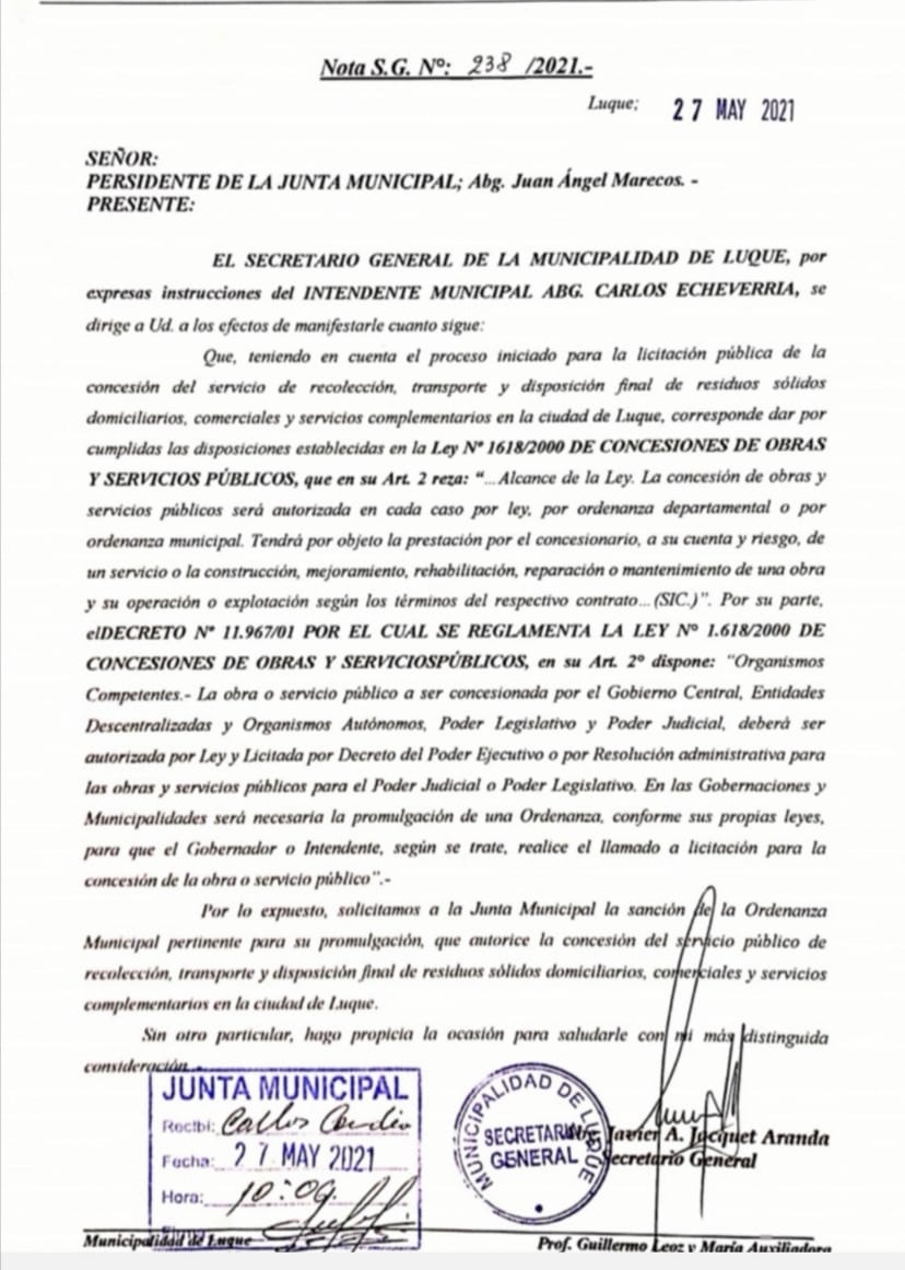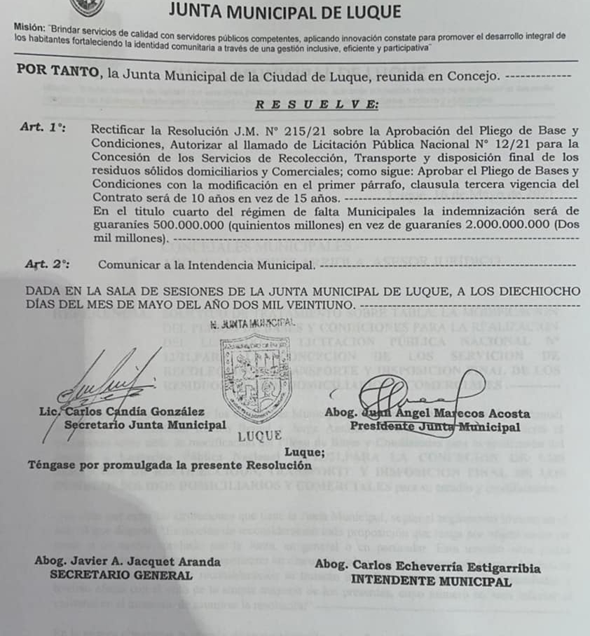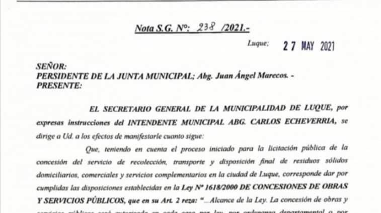 Es sobre la polémica licitación de recolección de basuras; la Junta Municipal remitió la  resolución a la intendencia, por la cual se aprueba el pliego de bases y condiciones, cuando previamente debería de ser sancionada una ordenanza que autorice la concesión del servicio.