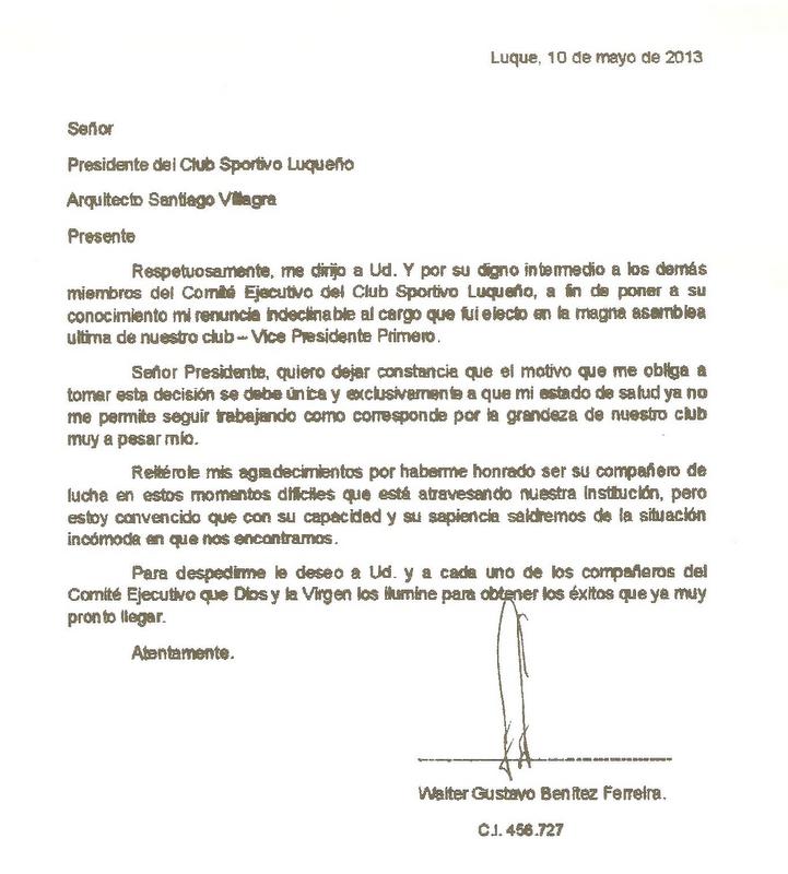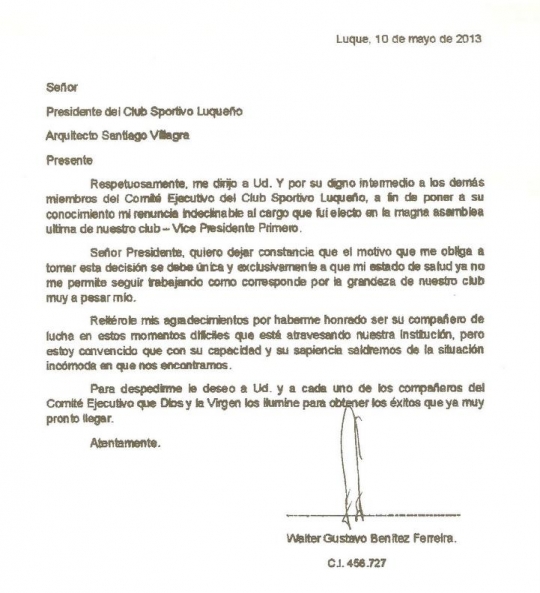 WALTER GUSTAVO BENITEZ NIEGA SU RENUNCIA