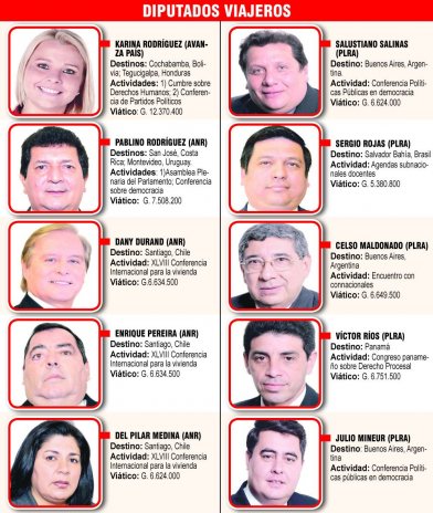 Otros legisladores que apenas ocuparon sus bancas se anotaron para los viajes son: Salustiano Salinas (Central), Julio Mineur (Presidente Hayes), Celso Maldonado (Central). Sergio Rojas (Central) y Víctor Ríos (Ñeembucú), todos del Partido Liberal Radical Auténtico.