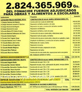 Es importante recalcar que el 50% (por lo menos) de estos recursos deben ser destinados a proyectos de infraestructura en educación, consistentes en construcción, remodelación, mantenimiento y equipamiento de centros educativos. El 30% a proyectos de almuerzo escolar, beneficiando a niños y niñas de Educación Inicial y Educación Escolar Básica del 1° y 2° ciclos de instituciones educativas del sector oficial, ubicados en contextos vulnerables, tales como: poblaciones indígenas, asentamientos, entre otros. Los saldos remanentes a Proyectos de Inversión Pública y de Desarrollo.