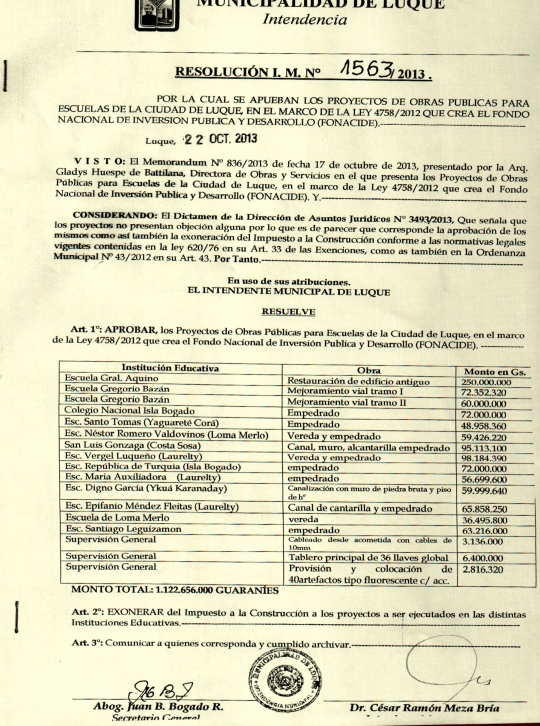 El intendente de Luque promulgo la Resolución Nº 1563/13 que aprueba los proyectos de obras de Fonacide.