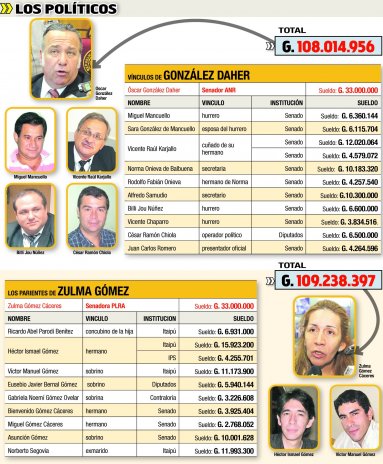 El senador colorado Óscar González Daher tiene a 10 de sus más leales operadores políticos y hurreros como funcionarios de la Cámara de Senadores. Tres de sus conocidos hurreros ganan más de G. 6 millones al mes. Por su parte, la senadora liberal Zulma Gómez ubicó a sus hermanos y sobrinos en varias instituciones, principalmente en Itaipú y el Senado. Uno de sus hermanos, Héctor Gómez, gana G. 15.923.200 en la binacional y cobra en IPS G. 4.255.701.