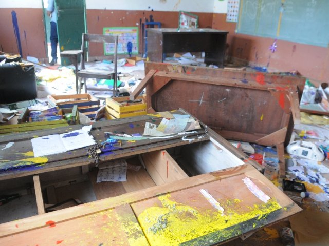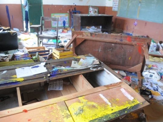 Muebles rotos, insumos como tizas, materiales didácticos, documentos de los alumnos, radios y cubiertos fueron lanzados en el piso y manchados con pintura.